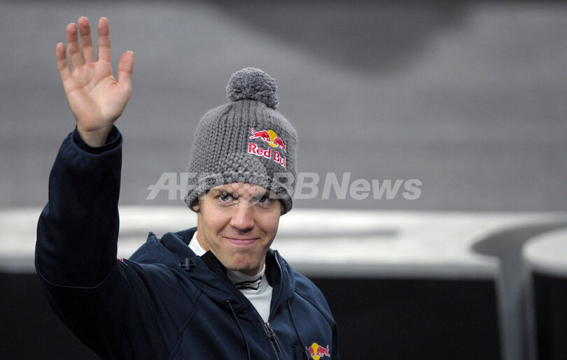 表彰式で観客に手を振るチーム・ドイツのセバスチャン・ベッテル(2011年12月3日撮影)。(c)AFP/JOHANNES EISELE