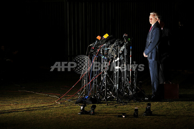 英ロンドン(London)のベルマーシュ治安判事裁判所(Belmarsh Magistrates' Court)で記者会見を行う、内部告発ウェブサイト「ウィキリークス(WikiLeaks)」の創設者ジュリアン・アサンジ(Julian Assange)容疑者(2011年2月8日撮影)。(c)AFP/Carl de Souza