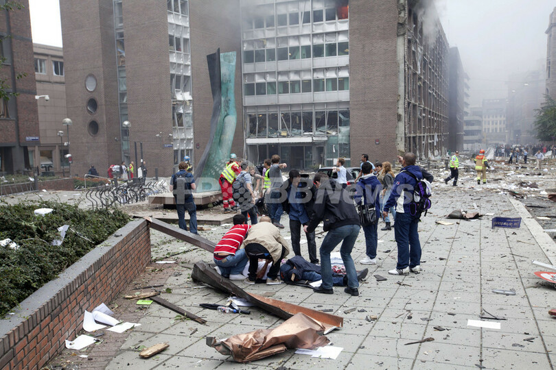 ノルウェーの首都オスロ(Oslo)で、政府庁舎ビル付近の爆発で負傷した人を救助する人びと。この事件でアンネシュ・ベーリング・ブレイビク(Anders Behring Breivik)容疑者が逮捕された(2011年7月22日撮影)。(c)AFP/SCANPIX/HOLM MORTEN