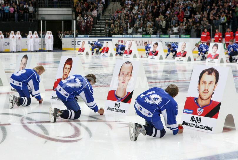ロシア西部ヤロスラブリ(Yaroslavl)近郊の旅客機墜落事故で犠牲となった、アイスホッケーチーム「ロコモティブ・ヤロスラブリ(Lokomotiv Yaroslavl)」の選手らの追悼式(2011年9月8日撮影)。(c)AFP/BELTA/MAXIM GUCHEK
