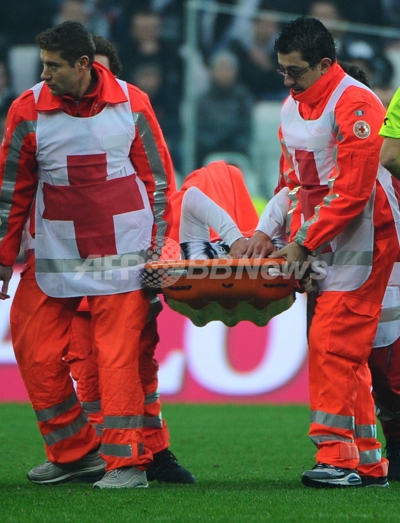 頭部を負傷し、担架で運ばれるユベントスのアレッサンドロ・デルピエロ(Alessandro del Piero、2011年12月4日撮影)。(c)AFP/OLIVIER MORIN