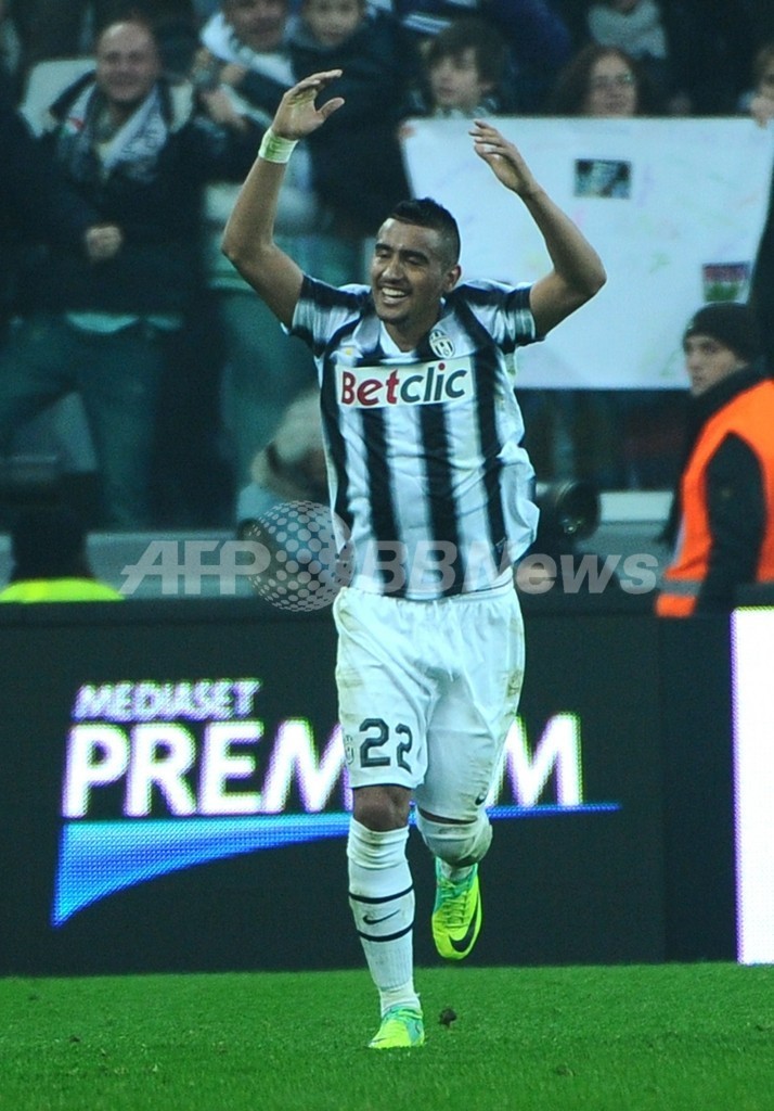 後半38分にPKを決め、歓喜するユベントスのアルトゥーロ・ビダル(Arturo Vidal、2011年12月4日撮影)。(c)AFP/OLIVIER MORIN