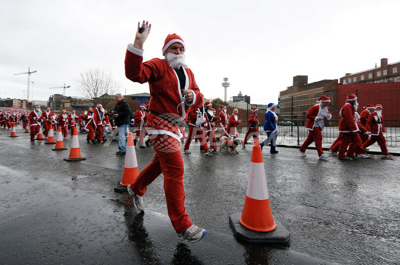 【12月5日 AFP】英イングランド北西部リバプール(Liverpool)で4日、サンタクロースの格好で市内5キロを走る毎年恒例のイベント「サンタ・ダッシュ」が行われ、推定8千人が参加した。リバプールには、サッカーのイングランド・プレミアリーグの人気チーム、リバプールとエバートン(Everton)があり、それぞれのシンボルカラーは赤と青。そのためか、ことしは赤だけでなく、青いサンタクロースの衣装で走る参加者の姿も見られた。(c)AFP