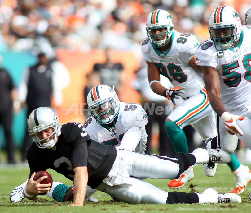 オークランド・レイダースパフォーマンスを披露するマイアミ・ドルフィンズのチアリーダー(2011年12月4日撮影)。(c)AFP/Getty Images/Mike Ehrmann