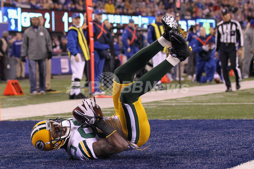 第2クォーターに15ヤードのタッチダウンパスレシーブを成功させるグリーンベイ・パッカーズのドナルド・ ドライバー(Donald Driver、2011年12月4日撮影)。(c)AFP/Getty Images/Nick Laham