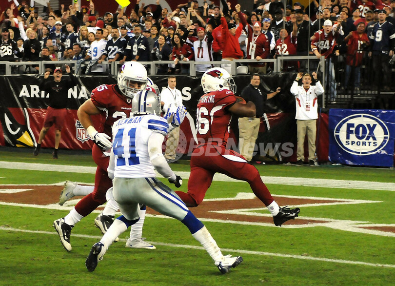 OTに決勝のタッチダウンを決めるアリゾナ・カーディナルスのラロッド・スティーブンス(LaRod Stephens-Howling、右、2011年12月4日撮影)。(c)AFP/Getty Images/Norm Hall