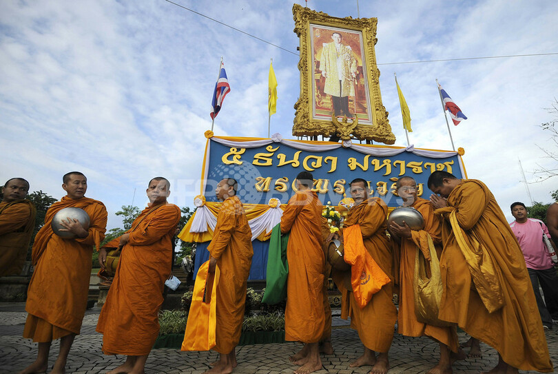 写真は、タイ南部ナラティワート(Narathiwat)県で行われた国王誕生日の祝賀行事で、托鉢を行う仏僧(2011年12月5日撮影)。(c)AFP/MADAREE TOHLALA