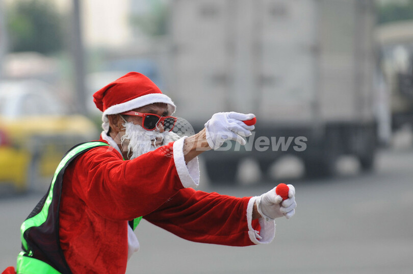 【12月7日 AFP】(写真追加)フィリピンの首都マニラ(Manila)の交差点に「交通整理サンタ」が登場した――サンタに扮しているのは、普段から「踊る交通警官」として有名なラミロ・イノハス(Ramiro Hinojas)巡査(55)。日々、いらついたドライバーに文句を言われたり、排ガスで健康をリスクにさらしながら、約150センチの小柄な体を張ってマニラの悪名高い渋滞道路を整理している。(c)AFP