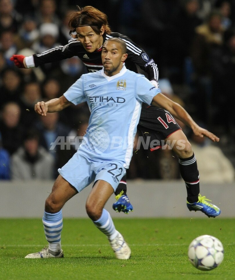 マンチェスター・シティのガエル・クリシー(Gael Clichy)とボールを競るバイエルン・ミュンヘンの宇佐美貴史(Takashi Usami、2011年12月7日撮影)。(c)AFP/ODD ANDERSON