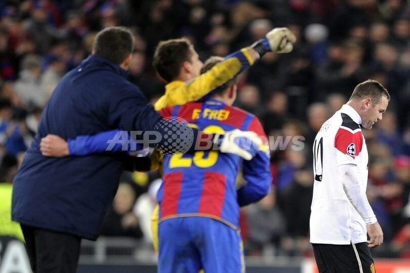 FCバーゼルの選手が歓喜する中、肩を落とすマンチェスター・ユナイテッドのウェイン・ルーニー(Wayne Rooney、2011年12月7日撮影)。(c)AFP/FABRICE COFFRINI