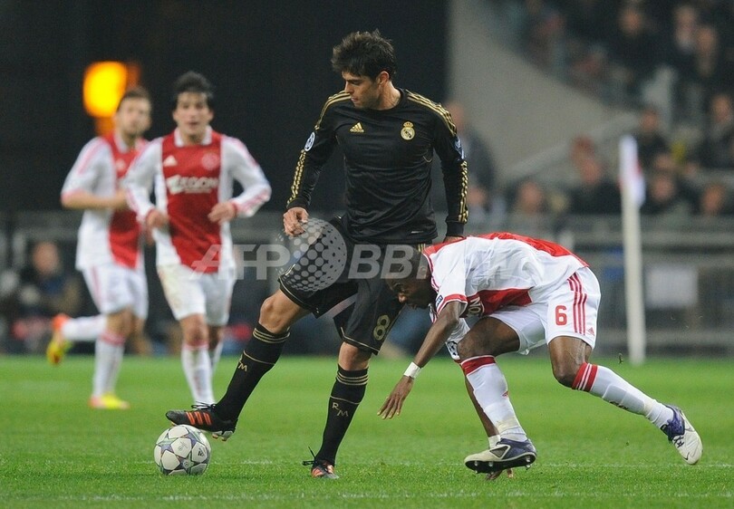 アヤックスのエヨング・タルカング・エノー(Eyong Tarkang Enoh)をかわすレアル・マドリードのカカ(Kaka、2011年12月7日撮影)。(c)AFP/JOHN THYS