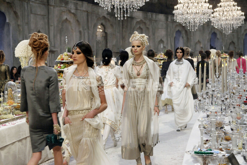 今年度はインドをテーマに、マハラジャの宮殿を想わせる華麗な作品を披露した。カールは「とても手の込んだ、普通のプレタポルテよりずっと高価なコレクションです」と語った。(c)AFP