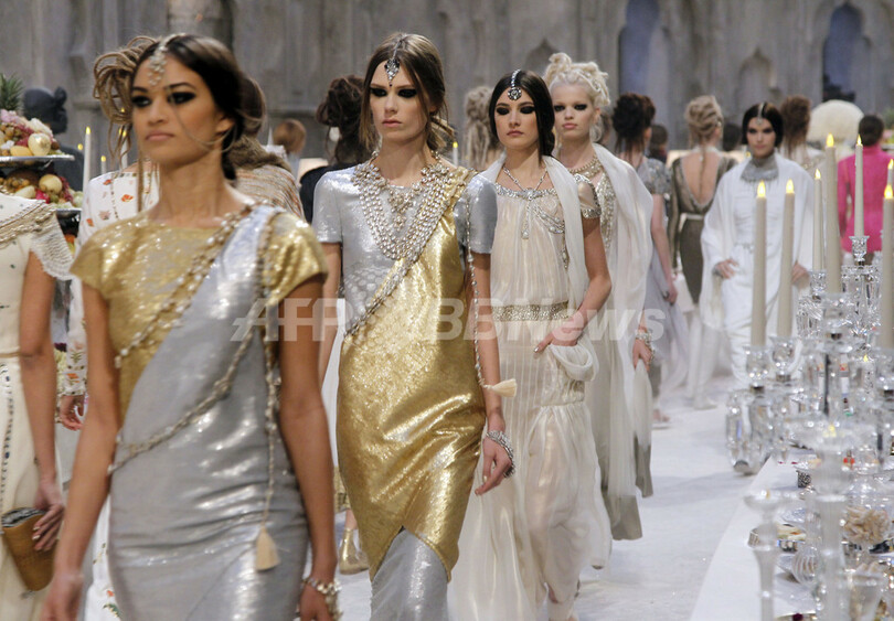 今年度はインドをテーマに、マハラジャの宮殿を想わせる華麗な作品を披露した。カールは「とても手の込んだ、普通のプレタポルテよりずっと高価なコレクションです」と語った。(c)AFP