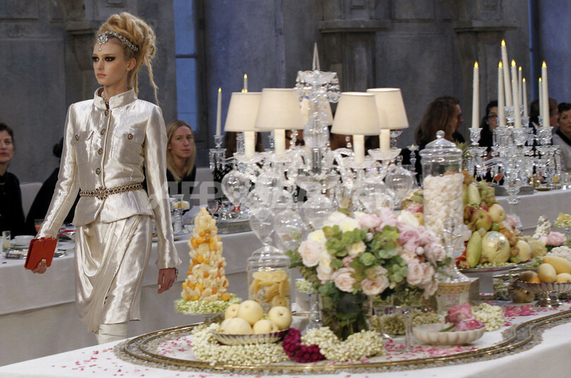 今年度はインドをテーマに、マハラジャの宮殿を想わせる華麗な作品を披露した。カールは「とても手の込んだ、普通のプレタポルテよりずっと高価なコレクションです」と語った。(c)AFP