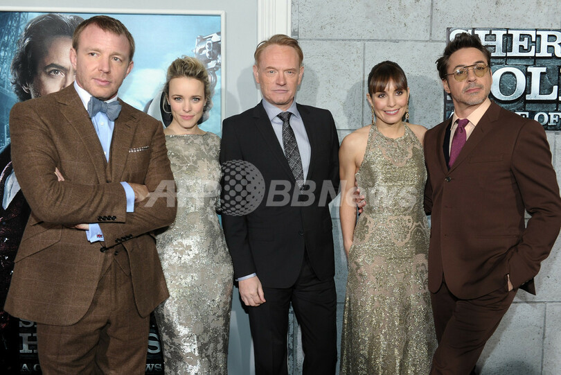 ロバート・ダウニー・Jr(Robert Downey Jr.)がシャーロック・ホームズ(Sherlock Holmes)を演じた大ヒット映画の第2弾『シャーロック・ホームズ シャドウ ゲーム(Sherlock Holmes: A Game Of Shadows)』のプレミア上映会が6日、米カリフォルニア(California)州ウエストウッド(Westwood)で開催された。同作の日本公開は3月。写真は、会場に到着した監督と出演者ら。(左から)ガイ・リッチー(Guy Ritchie)監督、出演者のレイチェル・マクアダムス(Rachel McAdams)、ジャレッド・ハリス(Jared Harris)、ノオミ・ラパス(Noomi Rapace)、ロバート・ダウニー・Jr(2011年12月6日撮影)。(c)AFP/Getty Images/Jason Merritt