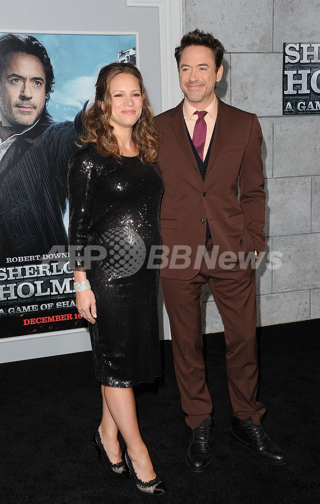 ロバート・ダウニー・Jr(Robert Downey Jr.)がシャーロック・ホームズ(Sherlock Holmes)を演じた大ヒット映画の第2弾『シャーロック・ホームズ シャドウ ゲーム(Sherlock Holmes: A Game Of Shadows)』のプレミア上映会が6日、米カリフォルニア(California)州ウエストウッド(Westwood)で開催された。同作の日本公開は3月。写真は、会場に到着したロバート・ダウニー・Jr(右)と妻でプロデューサーのスーザン・ダウニー(Susan Downey、2011年12月6日撮影)。(c)AFP/Getty Images/Jason Merritt
