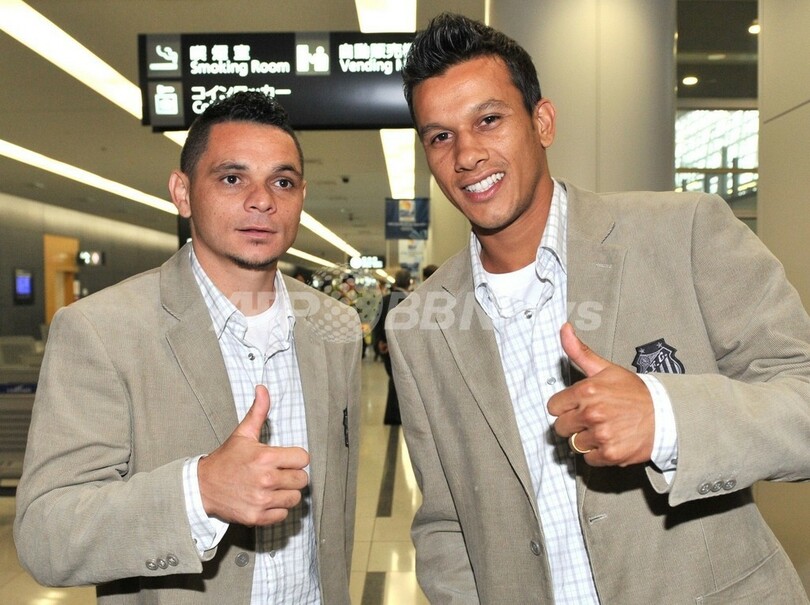 カメラに向かってポーズをとるサントスFCのパラ(Para、左)とエンリケ・パシェコ・デ・リマ(Henrique Pacheco Lima、2011年12月8日撮影)。(c)AFP/KAZUHIRO NOGI