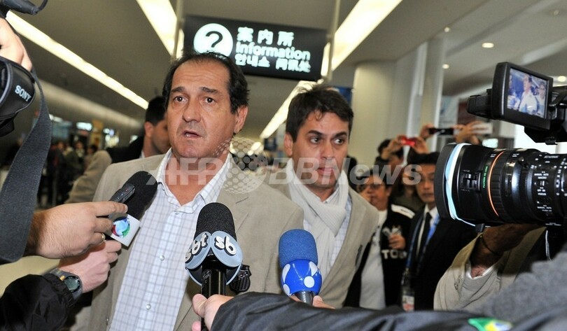 空港でテレビ局のインタビューに応じるサントスFCのムリシー・ラマーリョ(Muricy Ramalho)監督(2011年12月8日撮影)。(c)AFP/KAZUHIRO NOGI