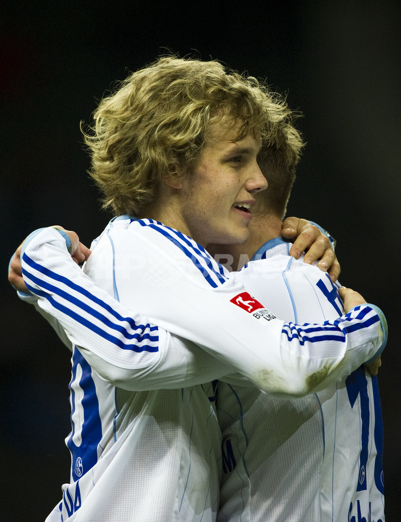 前半終了間際にチーム2得点目を挙げ、チームメイトと喜びを分かち合うシャルケのテーム・プッキ(Teemu Pukki、2011年12月9日撮影)。(c)AFP/JOHN MACDOUGALL