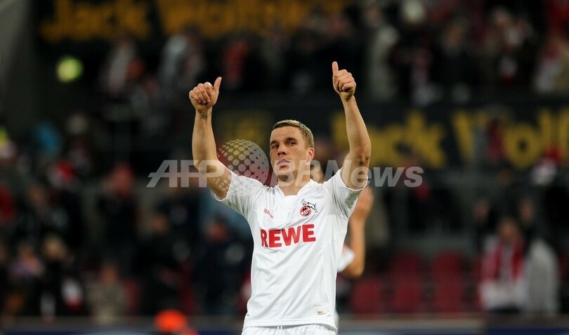 試合に勝利し歓喜するケルンのルーカス・ポドルスキー(Lukas Podolski、2011年12月10日撮影)。(c)AFP/PATRIK STOLLARZ
