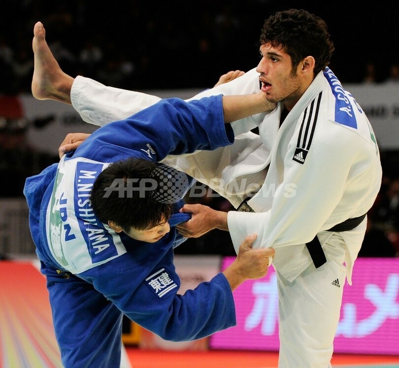 男子90キロ級決勝でキューバのアスレイ・ゴンザレス(Asley Gonzalez)と対戦する西山将士(Masashi Nishiyama、2011年12月10日撮影)。(c)AFP/Toru YAMANAKA