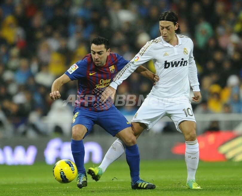 ボールを競るFCバルセロナのシャビ・エルナンデス(Xavi Hernandez)とレアル・マドリードのメスト・エジル(Mesut Ozil、2011年12月10日撮影)。(c)AFP/PIERRE-PHILIPPE MARCOU