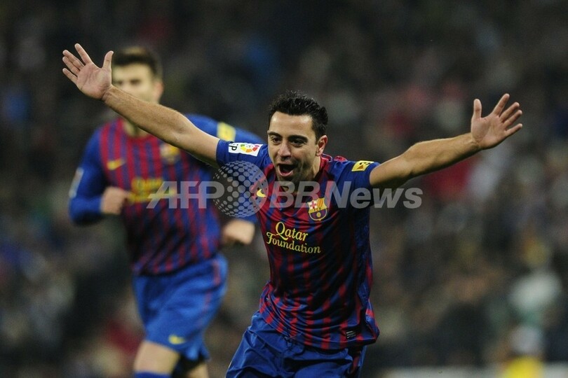 後半8分にチーム3得点目を挙げて歓喜するFCバルセロナのシャビ・エルナンデス(Xavi Hernandez、2011年12月10日撮影)。(c)AFP/JAVIER SORIANO