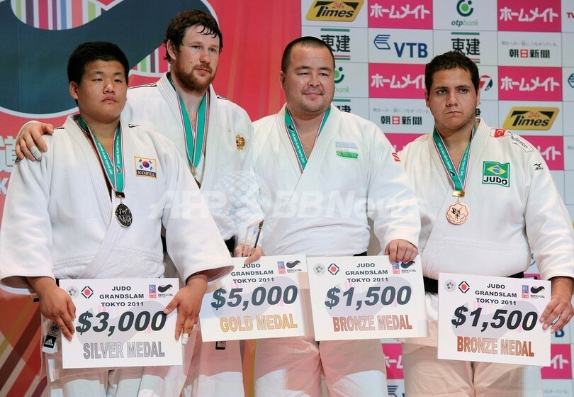 男子100キロ超級の表彰式に臨む(左から)2位に入った韓国のチョ・グハン(Cho Guham)、優勝したロシアのアレクサンダー・ミハイリン(Alexander Mikhaylin)、3位に入ったブラジルのアブドゥロ・タングリエフ(Abdulllo Tangriev)とウズベキスタンのラファエル・シルバ(Rafael Silva、2011年12月11日撮影)。(c)AFP/Toru YAMANAKA