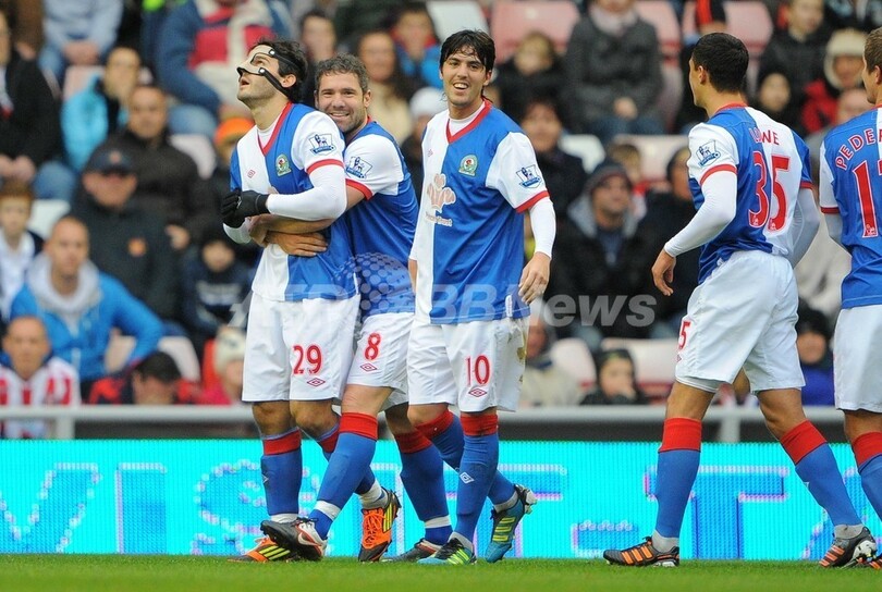 ゴールを決め、チームメイトと喜ぶブラックバーン・ローバーズのシモン・ヴクチェヴィッチ(Simon Vukcevic、左、2011年12月11日撮影)。(c)AFP/ANDREW YATES
