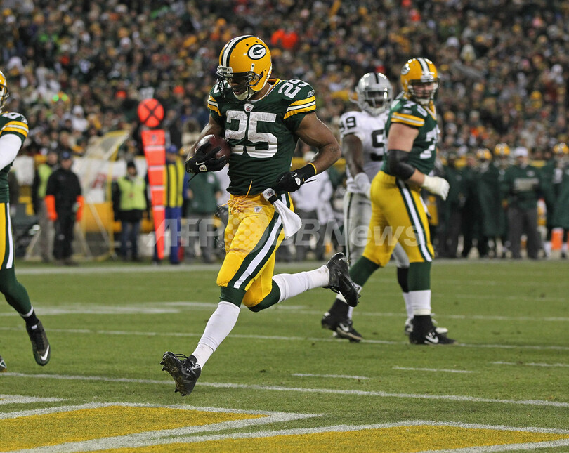 タッチダウンを決めるグリーンベイ・パッカーズのライアン・グラント(Ryan Grant、2011年12月11日撮影)。(c)AFP/Getty Images/Jonathan Daniel