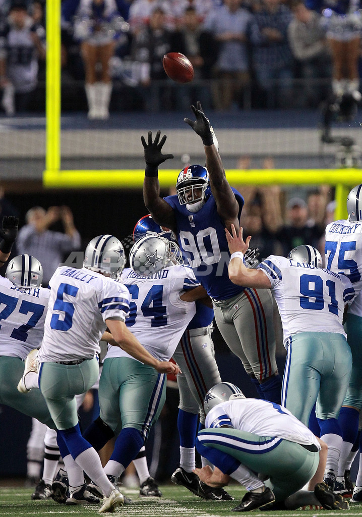 第4クォーターにダラス・カウボーイズのダン・ベイリー(Dan Bailey、手前左)フィールドゴールをブロックするニューヨーク・ジャイアンツのジェイソン・ピエール・ポール(Jason Pierre-Paul、中央上、2011年12月11日撮影)。(c)AFP/Getty Images/Ronald Martinez