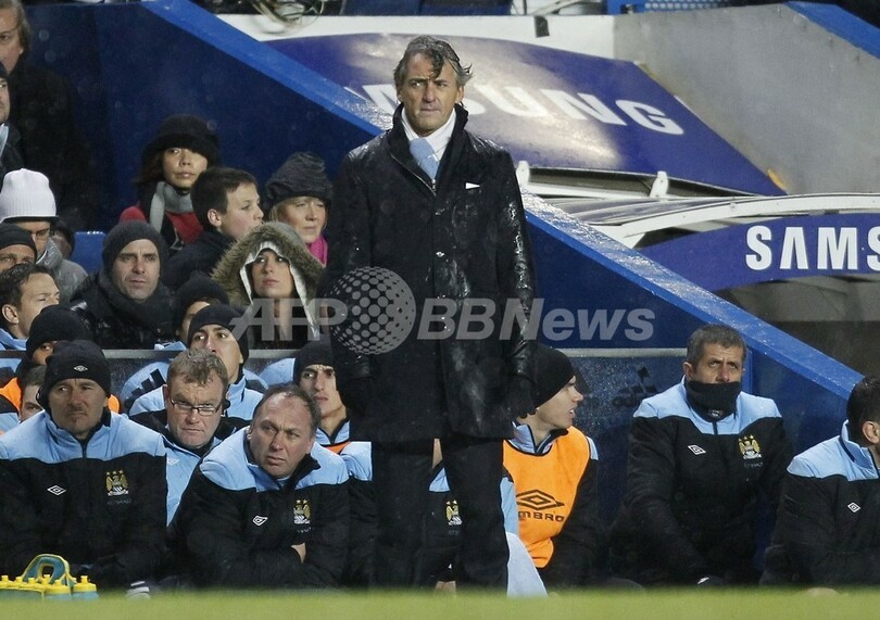 ピッチ脇で戦況を見つめるマンチェスター・シティのロベルト・マンチーニ監督(Roberto Mancini、2011年12月12日撮影)。(c)AFP/IAN KINGTON