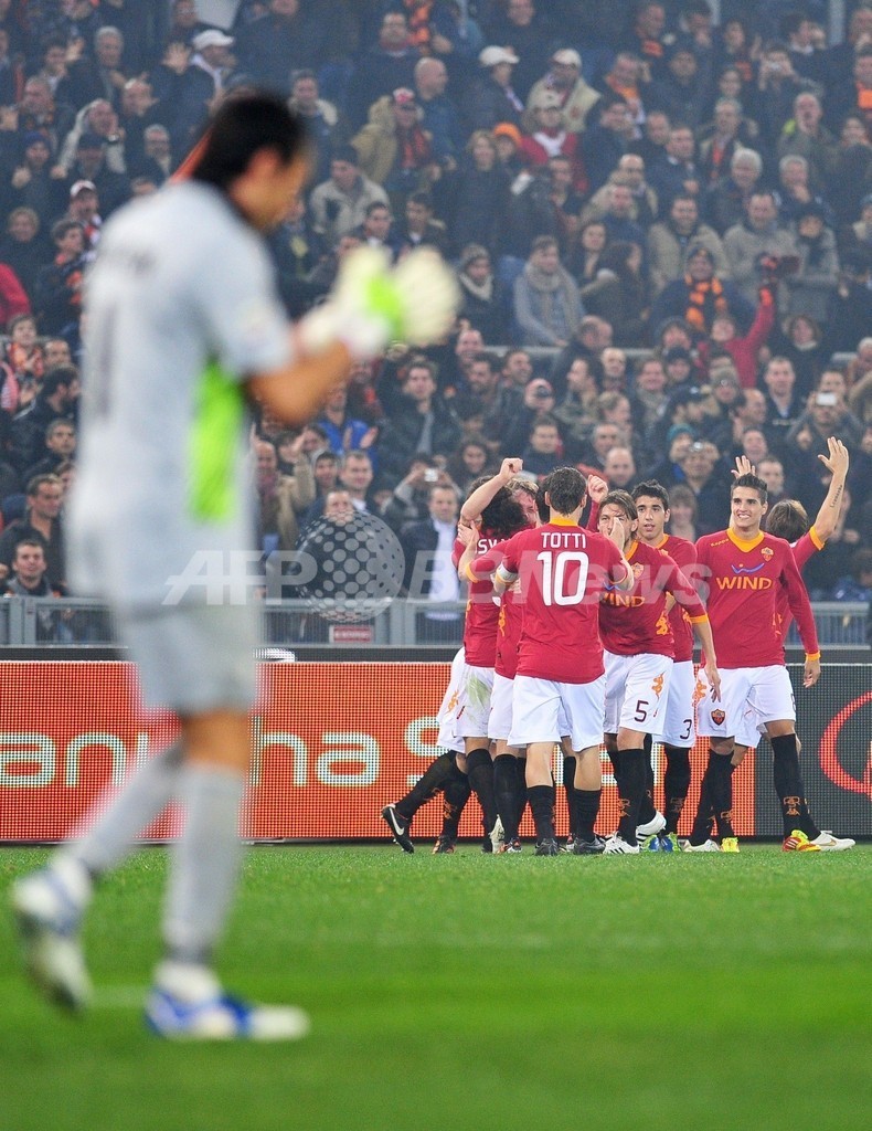 前半5分にダニエレ・デ・ロッシ(Daniele De Rossi)の挙げた先制点を喜ぶASローマの選手(2011年12月11日撮影)。(c)AFP/ALBERTO PIZZOLI
