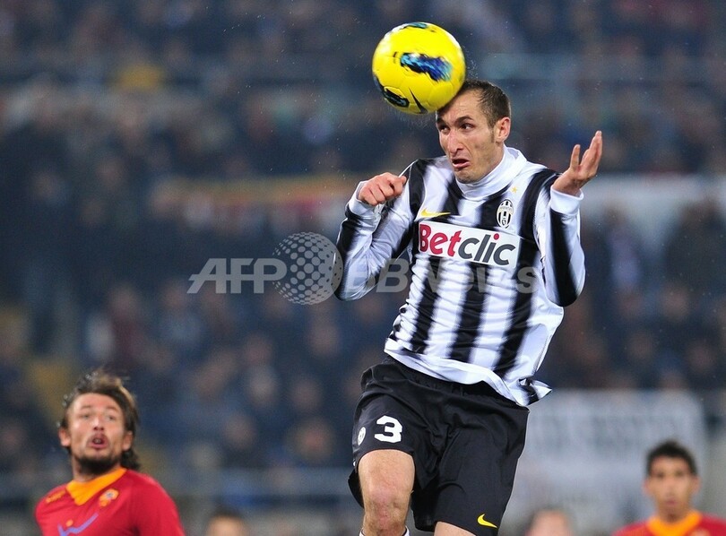 後半16分に同点ゴールを決めるユベントスのジョルジョ・キエッリーニ(Giorgio Chiellini、2011年12月12日撮影)。(c)AFP/ALBERTO PIZZOLI