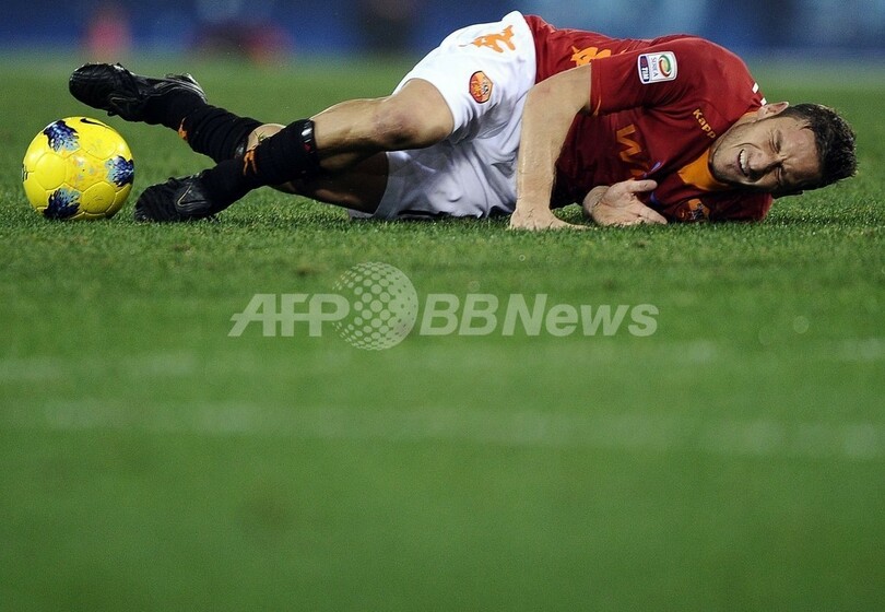 ピッチに倒れこむASローマのフランチェスコ・トッティ(Francesco Totti、2011年12月12日撮影)。(c)AFP/Filippo MONTEFORTE