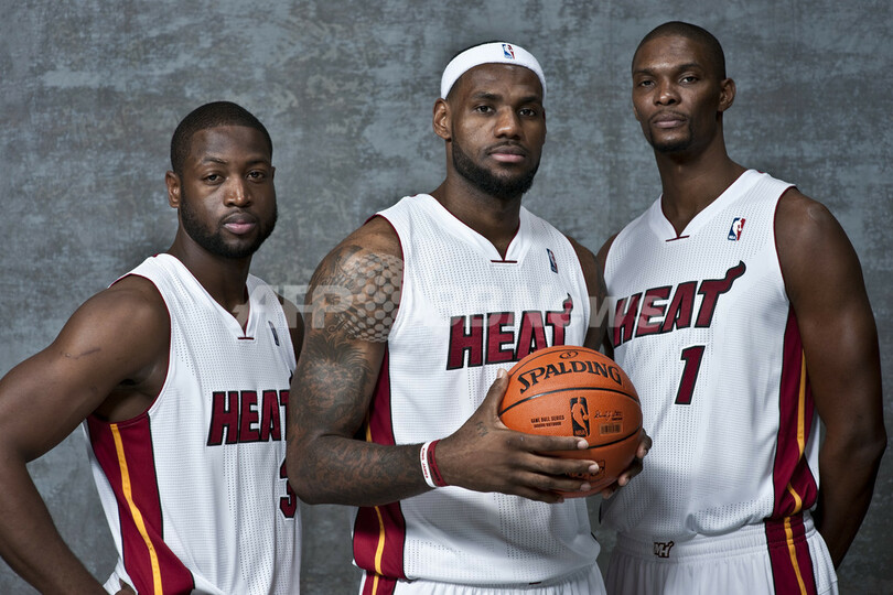 撮影に臨むマイアミ・ヒートの(左から)ドウェイン・ウェイド(Dwyane Wade)、レブロン・ジェームズ(LeBron James)、クリス・ボッシュ(Chris Bosh、2011年12月12日撮影)。(c)AFP/Getty Images/NBAE/Jennifer Pottheiser