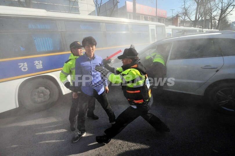 【12月13日 AFP】韓国・ソウル(Seoul)の在韓中国大使館前で13日、前日黄海(Yellow Sea)で韓国海洋警察官が中国人漁船船長に殺傷されたことへの抗議行動が行われていたところ、中国大使館を警護していた警察のバスに男が繰り返し車をぶつけて逮捕された。