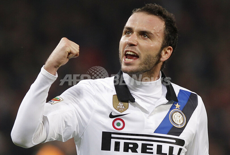 試合に勝利し歓喜するインテルのジャンパオロ・パッツィーニ(Giampaolo Pazzini、2011年12月13日撮影)。(c)AFP/FABIO MUZZI