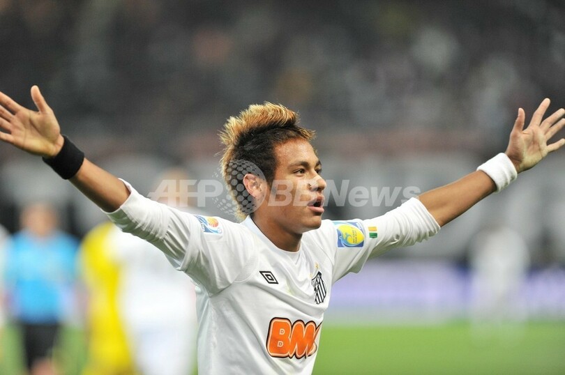 前半19分に先制点を挙げて歓喜するサントスのネイマール(Neymar da Silva Santos Junior、2011年12月14日撮影)。(c)AFP/KAZUHIRO NOGI