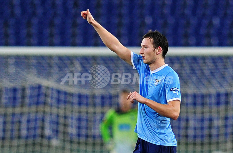 前半42分に先制点を挙げて歓喜するラツィオのリボル・コザク(Libor Kozak、2011年12月14日撮影)。(c)AFP/ALBERTO PIZZOLI