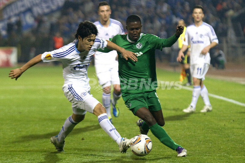 マッカビ・ハイファの選手とボールを競るシャルケ04の内田篤人(Atsuto Uchida、2011年12月14日撮影)。(c)AFP/JACK GUEZ
