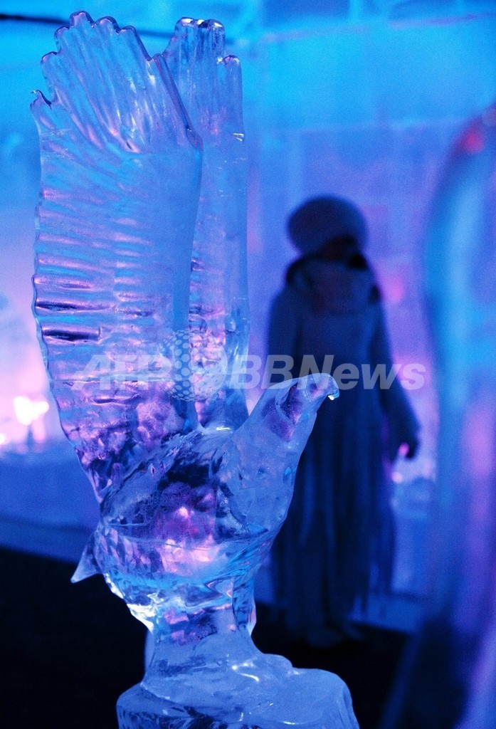 写真は、「サンタクロース村」に飾られた氷でできた動物たち(2011年12月14日撮影)。(c)AFP/JONATHAN NACKSTRAND