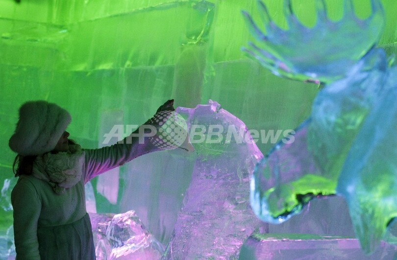 写真は、「サンタクロース村」に飾られた氷でできた動物たち(2011年12月14日撮影)。(c)AFP/JONATHAN NACKSTRAND