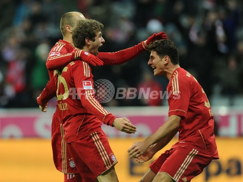 後半3分にマリオ・ゴメス(Mario Gomez)のリーグ戦16試合で16得点目となるゴールで先制したバイエルンは、同18分には途中交代で出場したデヴィッド・アラバ(David Alaba)が追加点を挙げると、終盤にはトニ・クロース(Toni Kroos)の得点でとどめを刺した。(c)AFP
