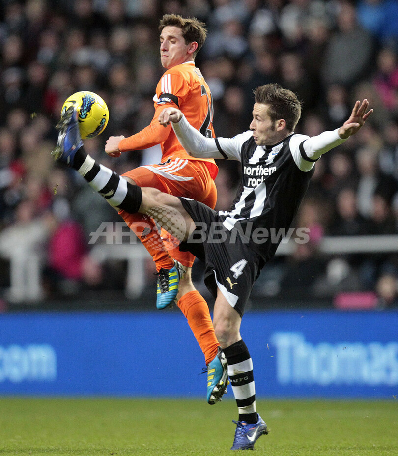 スウォンジー・シティのジョー・アレン(Joe Allen、左)とボールを競るニューカッスルのヨハン・カバイェ(Yohan Cabaye、2011年12月17日撮影)。(c)AFP/GRAHAM STUART