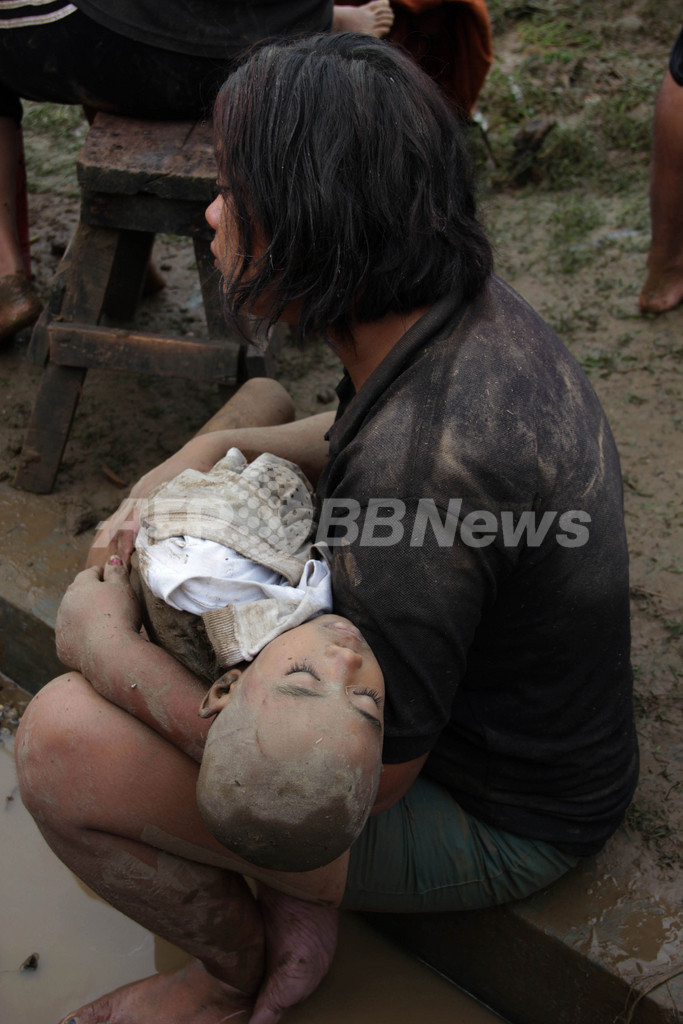 フィリピン南部ミンダナオ(Mindanao)島イリガン(Iligan)市の村で、台風21号で亡くなったわが子の遺体を抱える母親(2011年12月17日撮影)。(c)AFP/Cherryl Vergeire