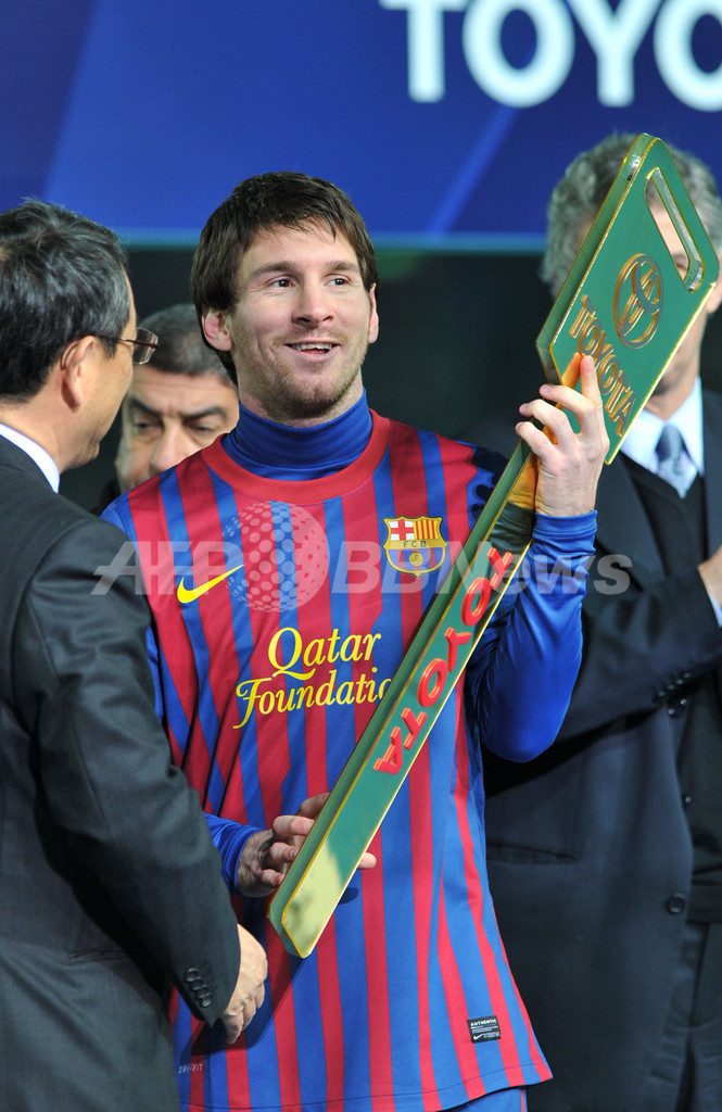 大会最優秀選手(MVP)に選ばれ、商品を受け取るFCバルセロナのリオネル・メッシ(Lionel Messi、2011年12月18日撮影)。(c)AFP/KAZUHIRO NOGI