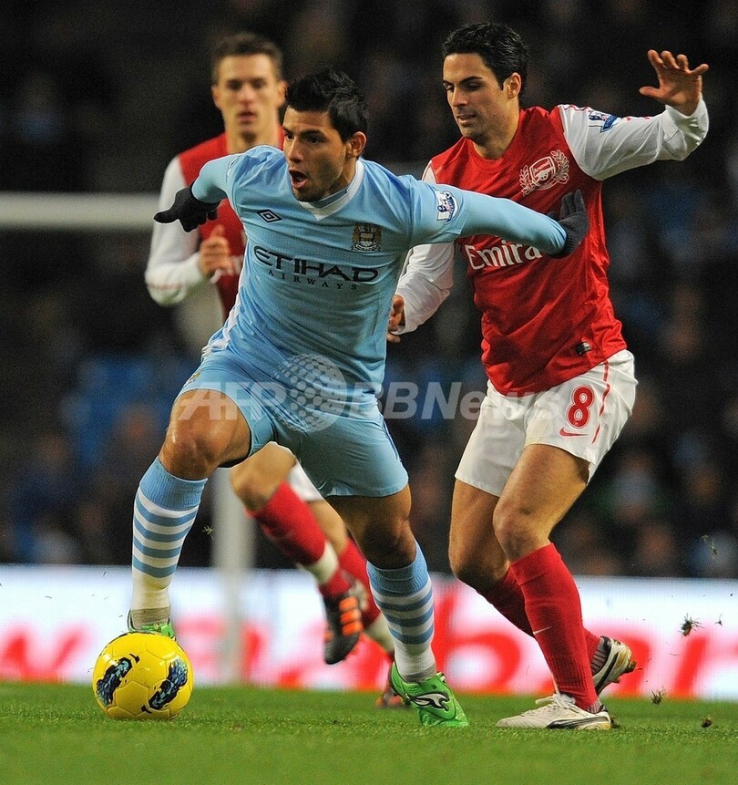 アーセナルのミケル・アルテタ(Mikael Arteta、右)のチェックを受けるマンチェスター・シティのセルヒオ・アグエロ(Sergio Aguero、2011年12月18日撮影)。(c)AFP/ANDREW YATES