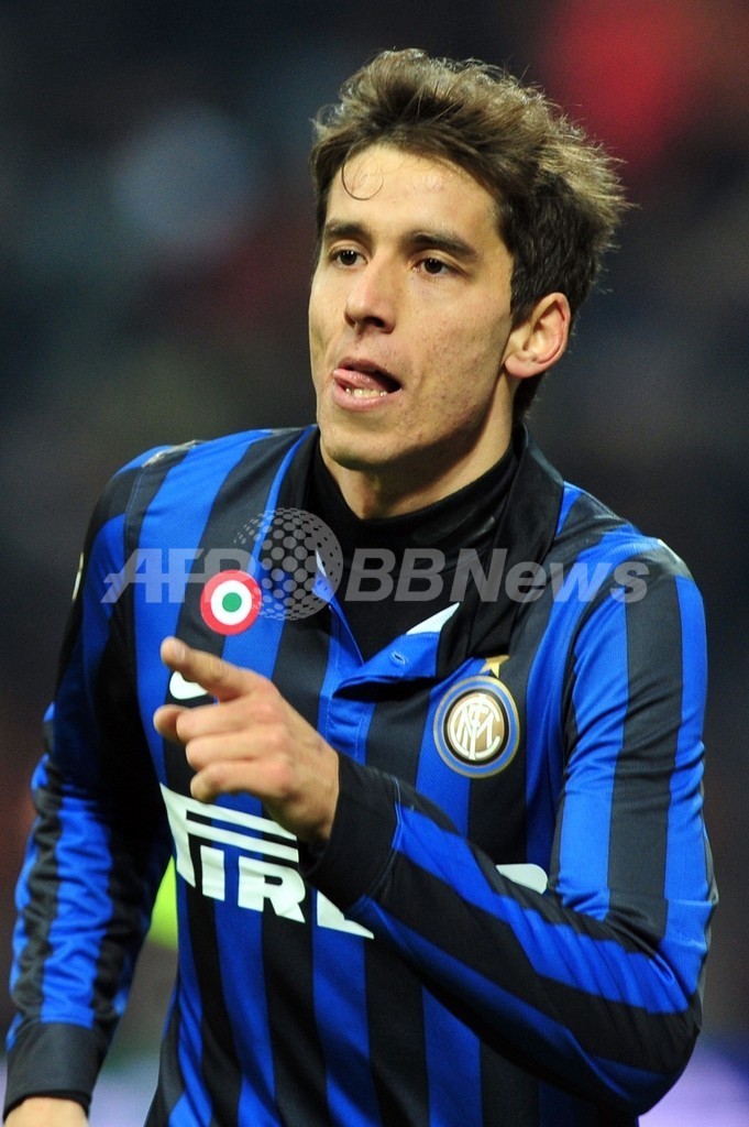 後半36分にチーム4得点目を挙げて歓喜するインテルのリカルド・アルバレス(Ricardo Alvarez、2011年12月21日撮影)。(c)AFP/GIUSEPPE CACACE