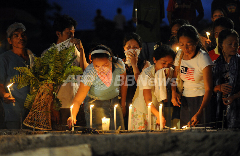 写真はイリガンの墓地に埋葬された遺体とキャンドルを灯す遺族(2011年12月20日撮影)。(c)AFP/TED ALJIBE
